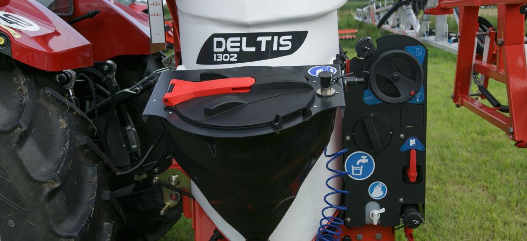Breveté, l'incorporateur Optifiller du Deltis 2 est conçu dans une matière plastique souple résistante à l'usure et aux produits les plus agressifs. L'intérêt est d'optimiser la capacité de la cuve du pulvérisateur et de ne pas dépasser de son gabarit. Une fois déplié, il contient 42 litres et offre une large ouverture pour faciliter l'incorporation de grands contenants. Il se manipule au pied afin de préserver l'opérateur et une lance à main permet de le rincer.